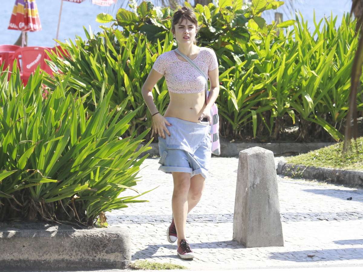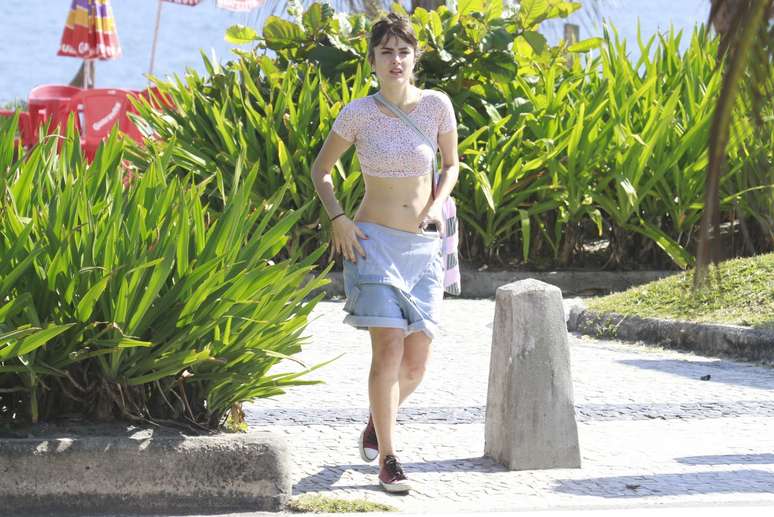Maria Casadevall aproveitou o dia ensolarado no Rio de Janeiro para passear na orla da Barra da Tijuca, nesta quinta-feira (21). Com a barriga de fora, a atriz comeu uma maçã e observou a paisagem, sempre checando o celular
