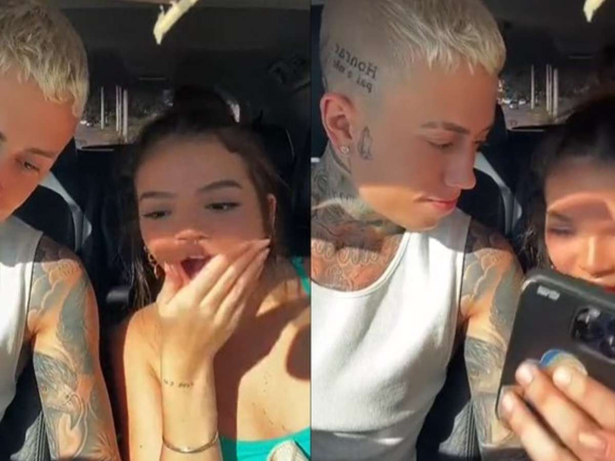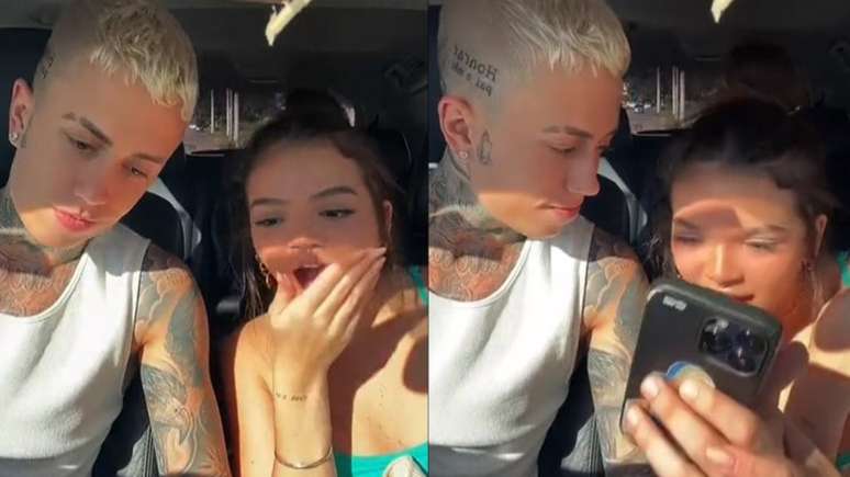 No vídeo, Mel Maia aparece ao lado do funkeiro, de boca aberta enquanto ele mostra as mensagens na tela do celular.