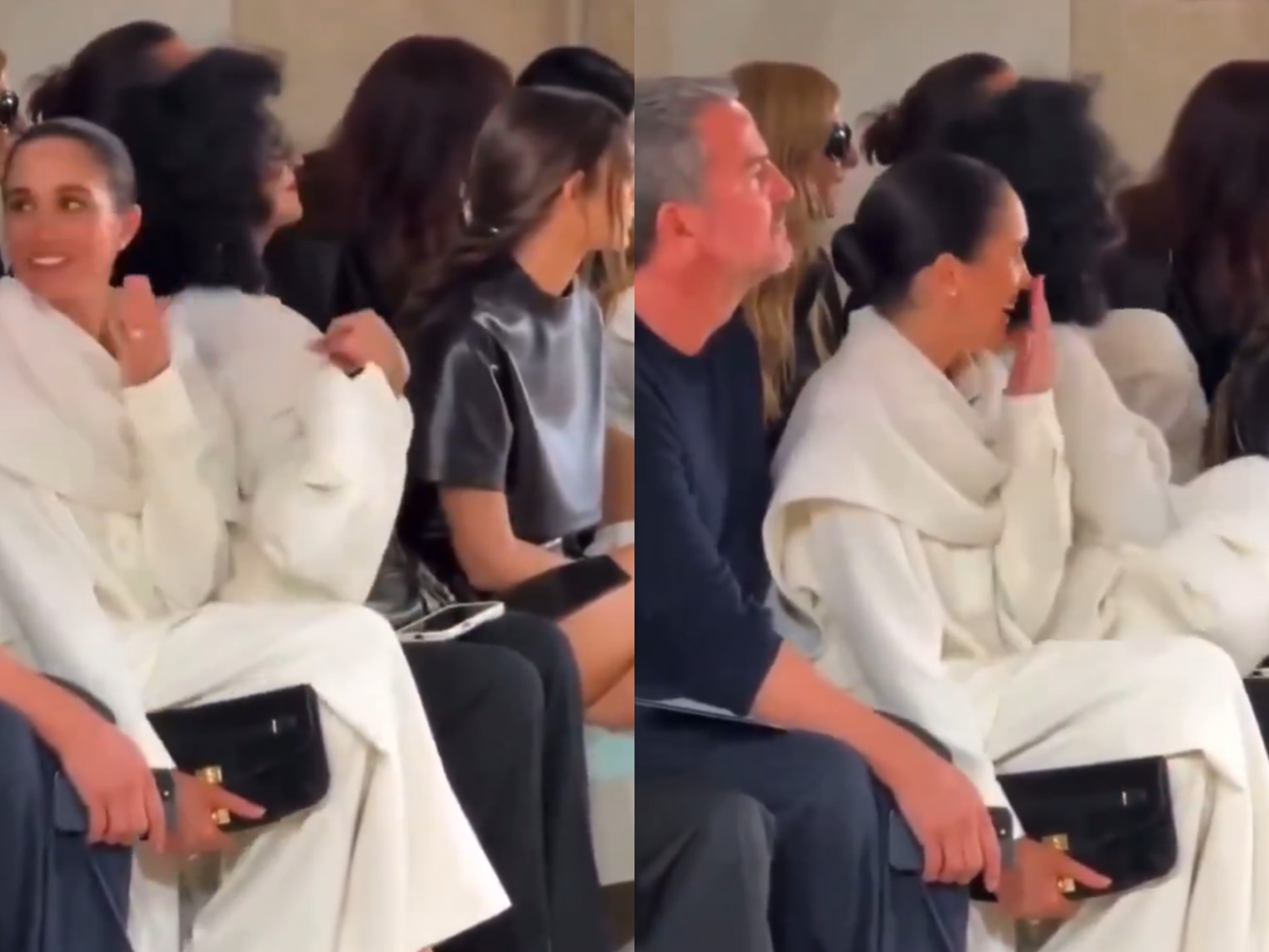 Nas imagens, Meghan está sentada na primeira fila do desfile ao lado do empresário Markus Anderson, que já foi apontado como o cupido que uniu ela e príncipe Harry. O vídeo mostra a ex-atriz dando risada e comentando o ocorrido com o amigo, que não dá atenção ao assunto.