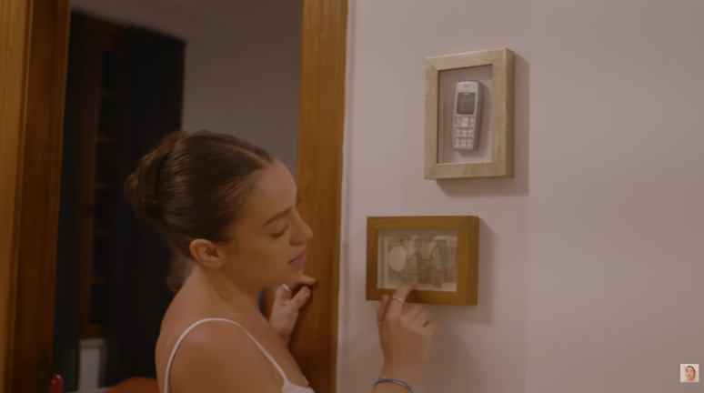 - Um celular antigo, dos anos 2000, emoldurado.