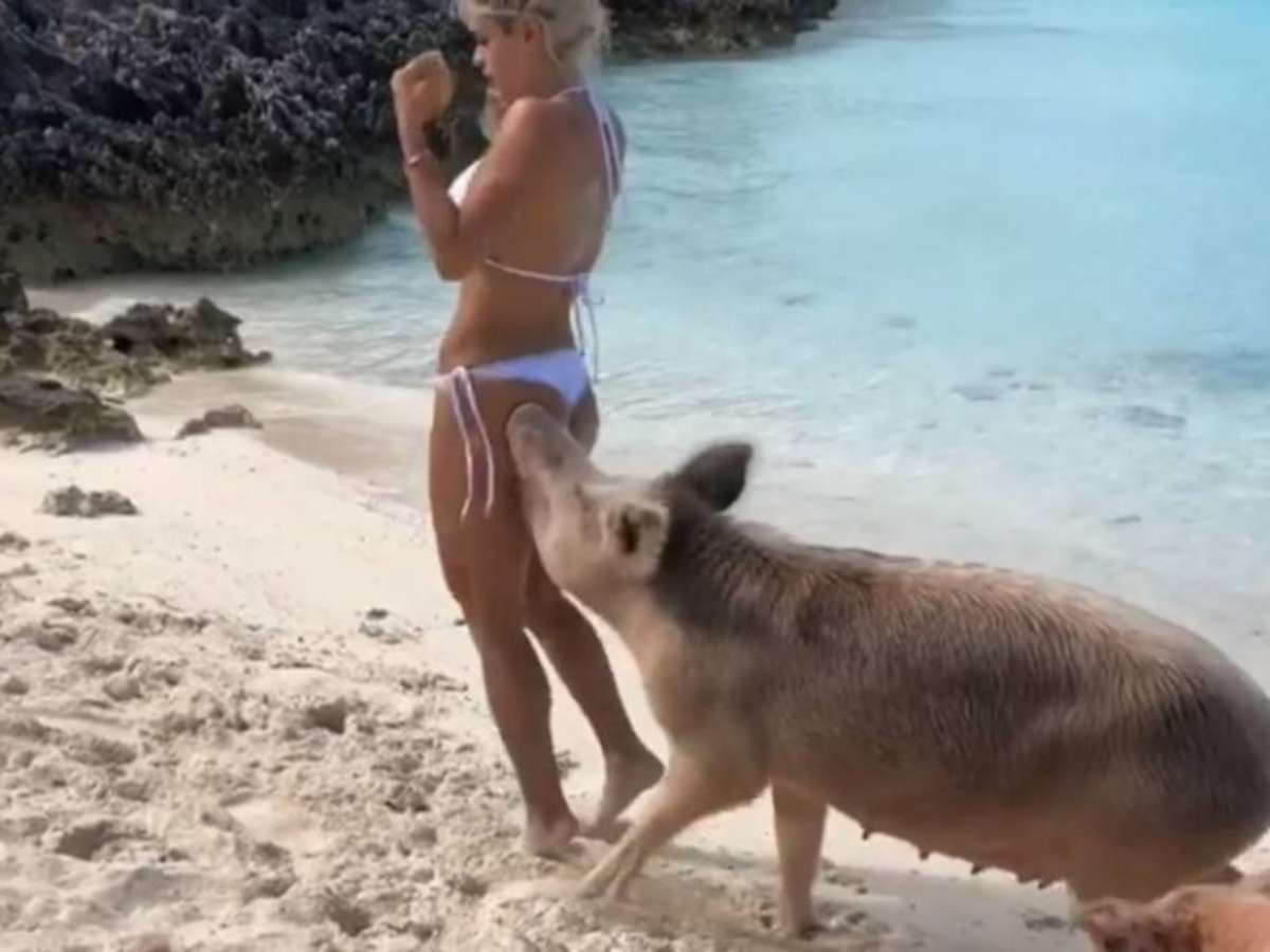 A modelo fitness e influenciadora digital Michelle Lewin levou um susto durante uma viagem às Bahamas, no Caribe, ao ser mordida por um porco. Ela estava posando para uma foto à beira do mar quando um dos suínos mordeu a região de seus glúteos.