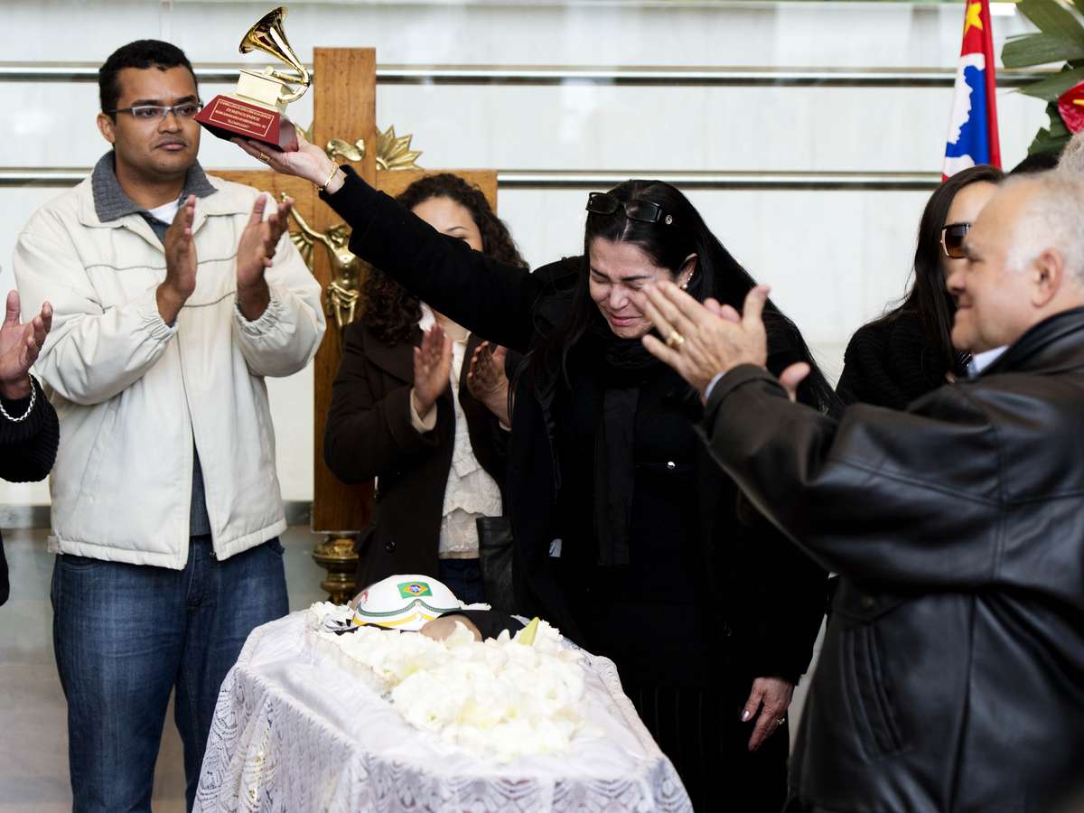 Guadalupe Mendonça exibe prêmio recebido por músico em 2002 em frente a seu caixão, em São Paulo