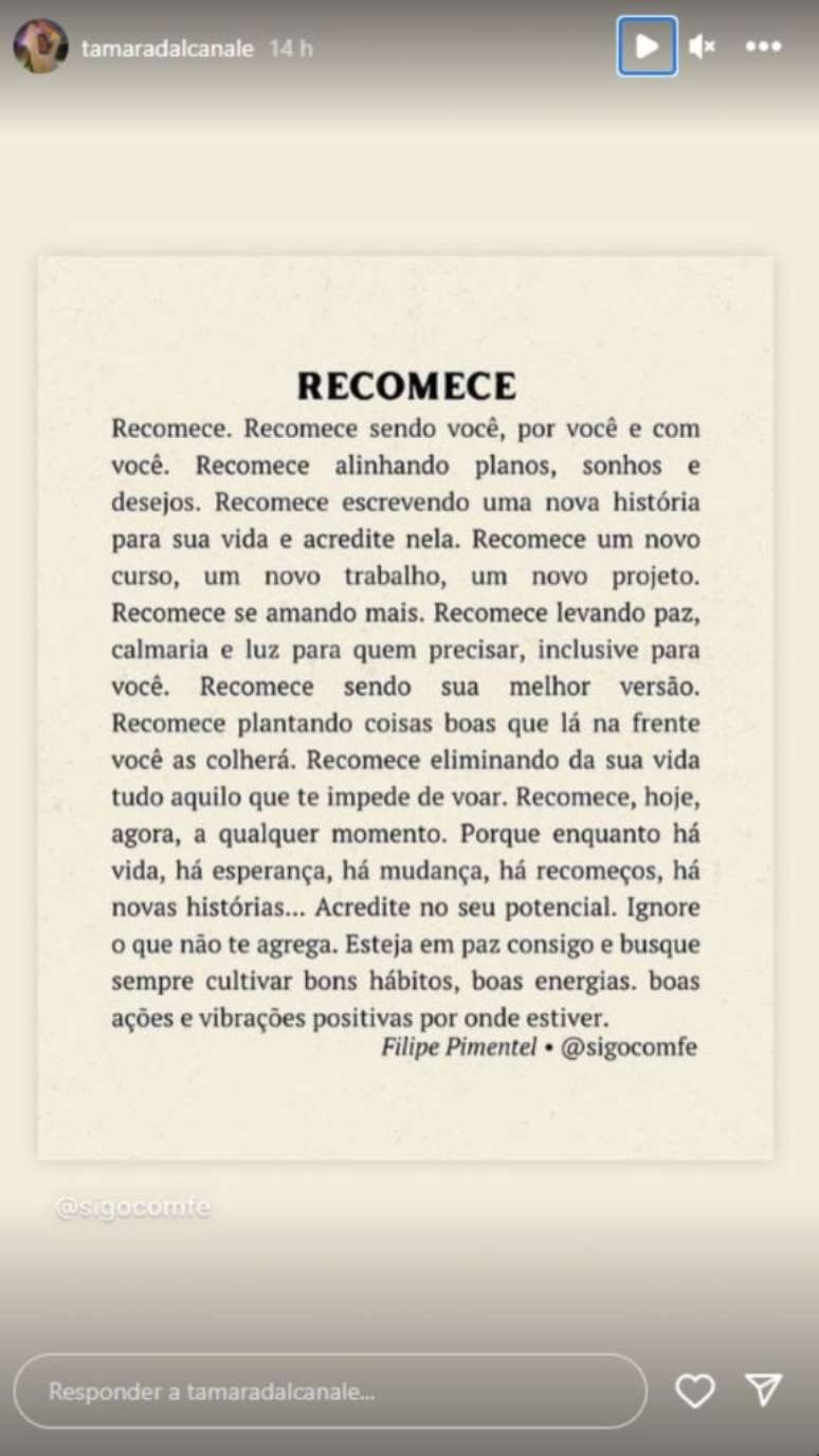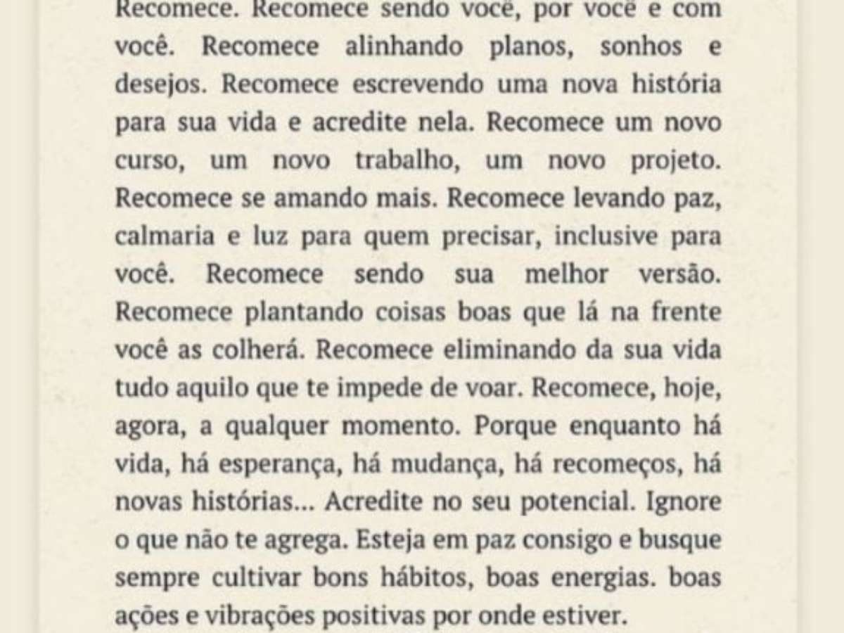 "Recomece. Recomece sendo você, por você e com você. Recomece alinhando planos, sonhos e desejos. Recomece escrevendo uma nova história para sua vida e acredite nela. Recomece um novo curso, um novo trabalho, um novo projeto. Recomece se amando mais. Recomece levando paz, calmaria e luz para quem precisar, inclusive para você. Recomece sendo sua melhor versão. Recomece plantando coisas boas que lá na frente você as colherá", dizia o texto.