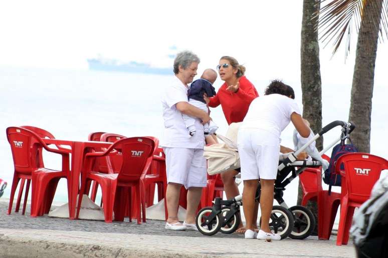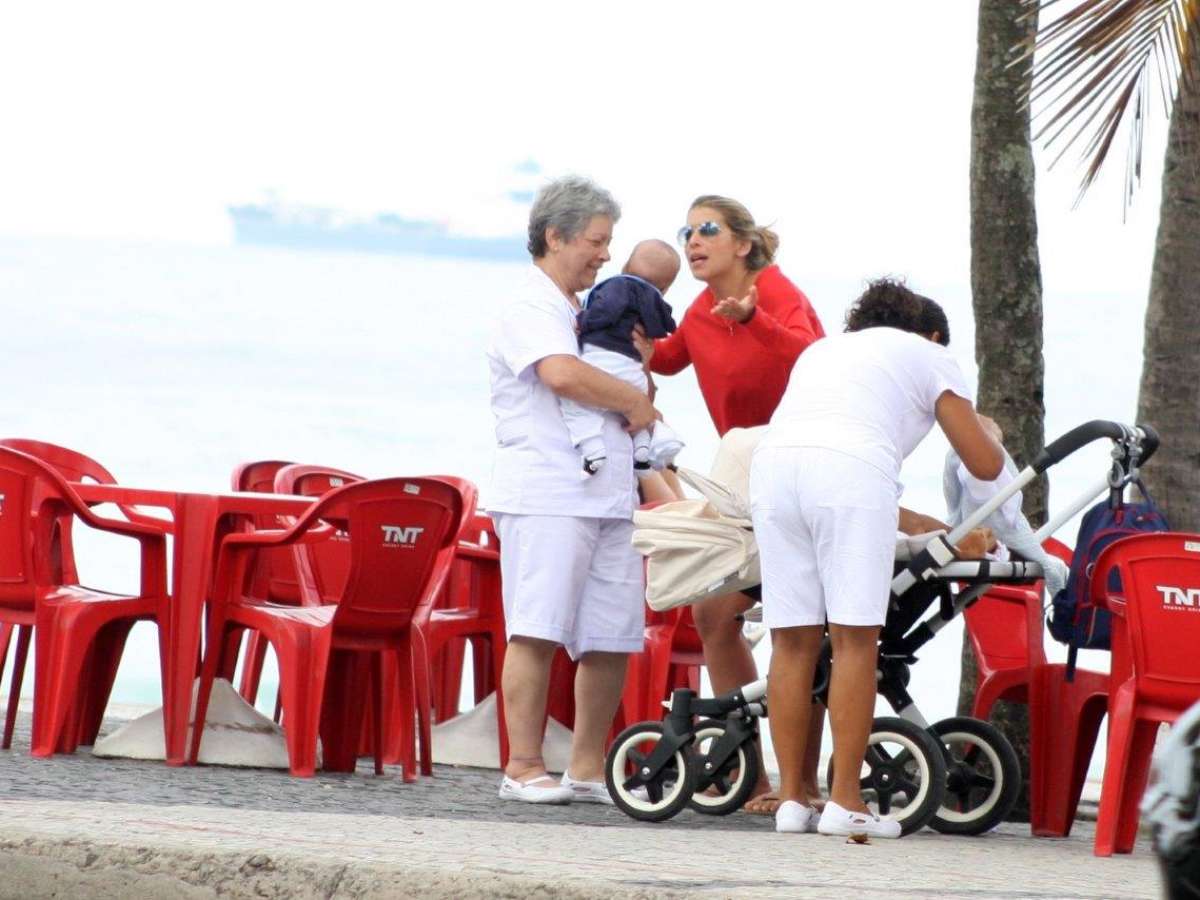 Mulher de Marcelo Serrado, a bailarina Roberta Fernandes, levou os gêmeos Felipe e Guilherme para um passeio pela orla de Ipanema, acompanhada de duas babás