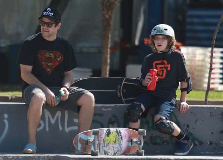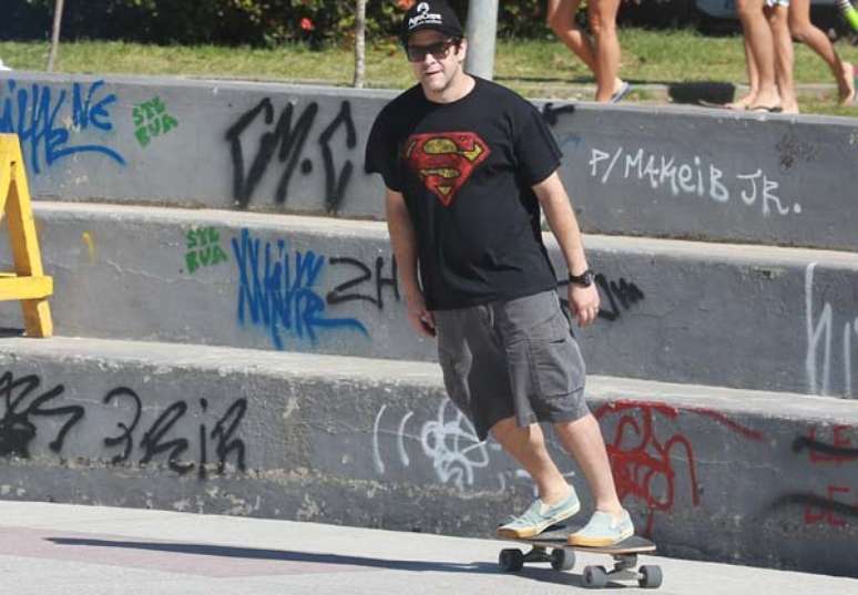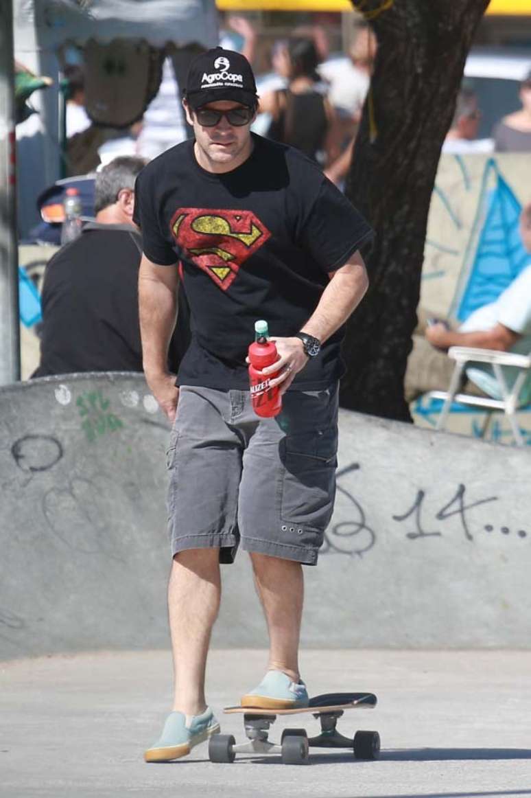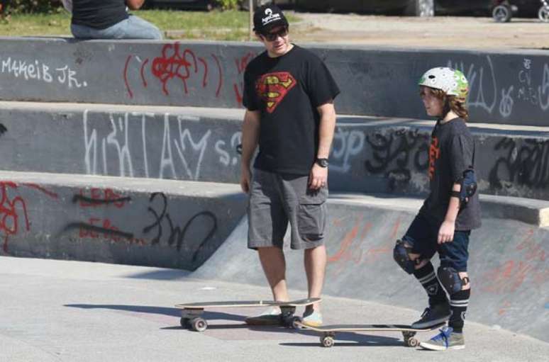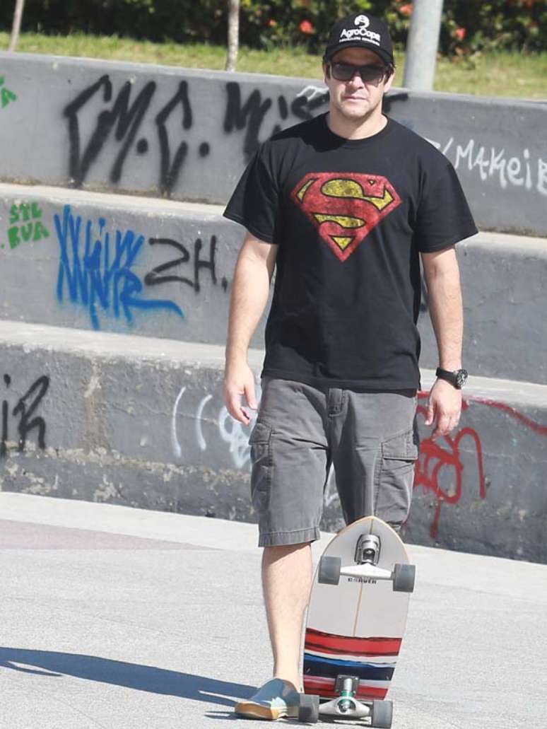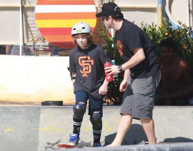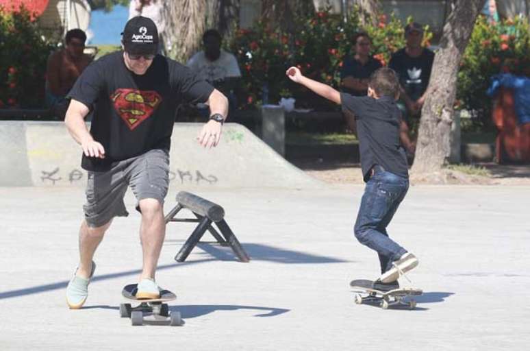Com uma camiseta de Super-Homem, Murilo ajudou o caçula, de nove anos, a praticar suas manobras. Depois, o próprio ator se arriscou em cima do skate.
