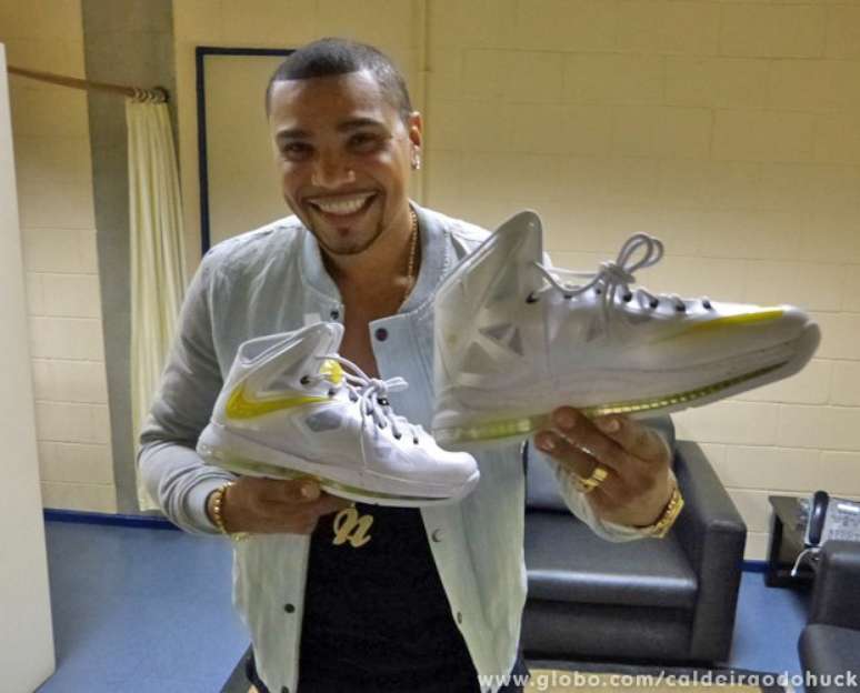 Pouco antes de entrar no palco do Caldeirão do Huck, da TV Globo, Naldo Benny mostrou o tênis especial que mandou fazer para usar no casamento com a Mulher Moranguinho. "Tinha que ser branco, mas pedi detalhes em amarelo porque são as cores preferidas da Ellen", explicou o cantor. As informações são do site oficial do programa global.