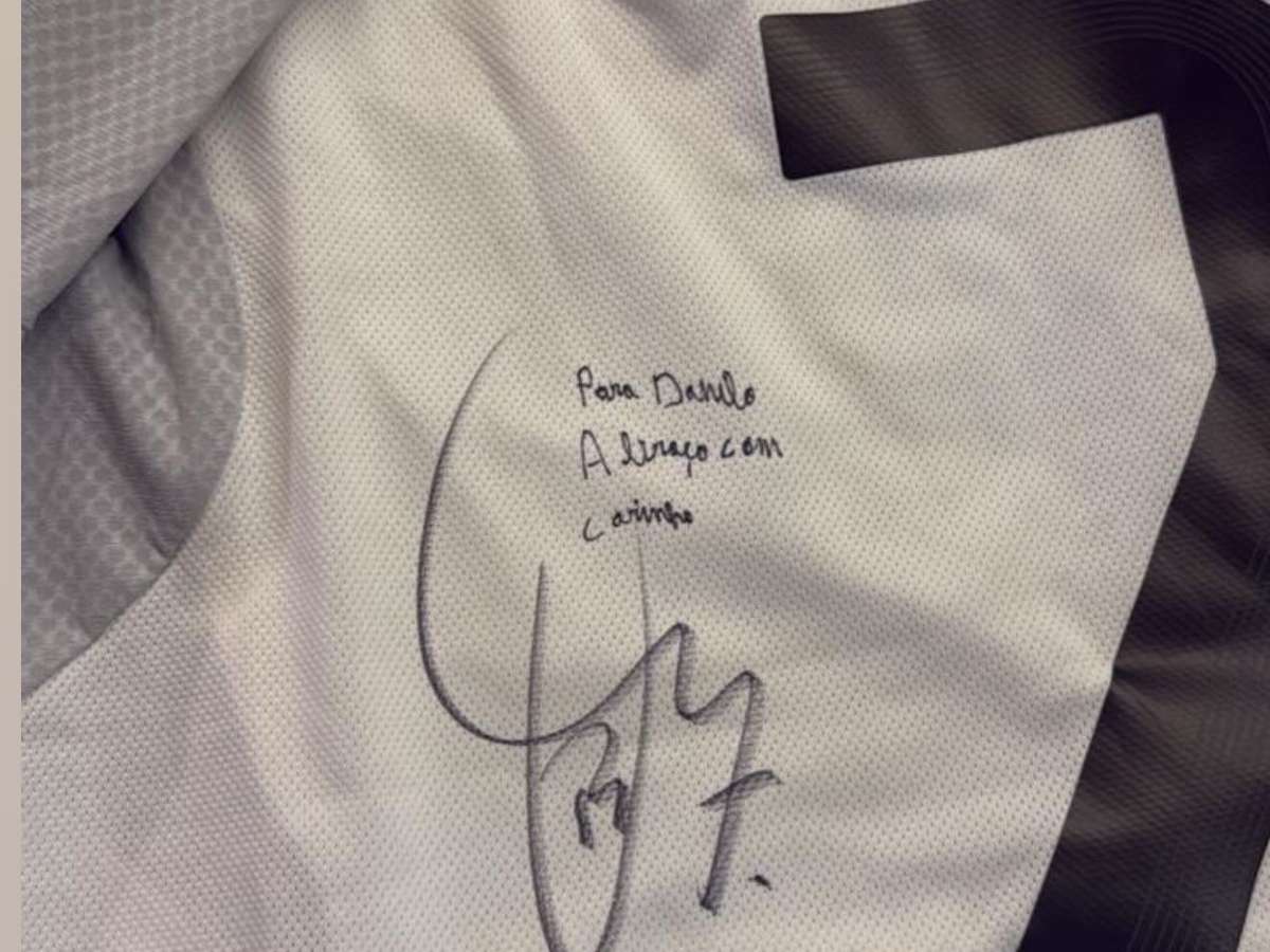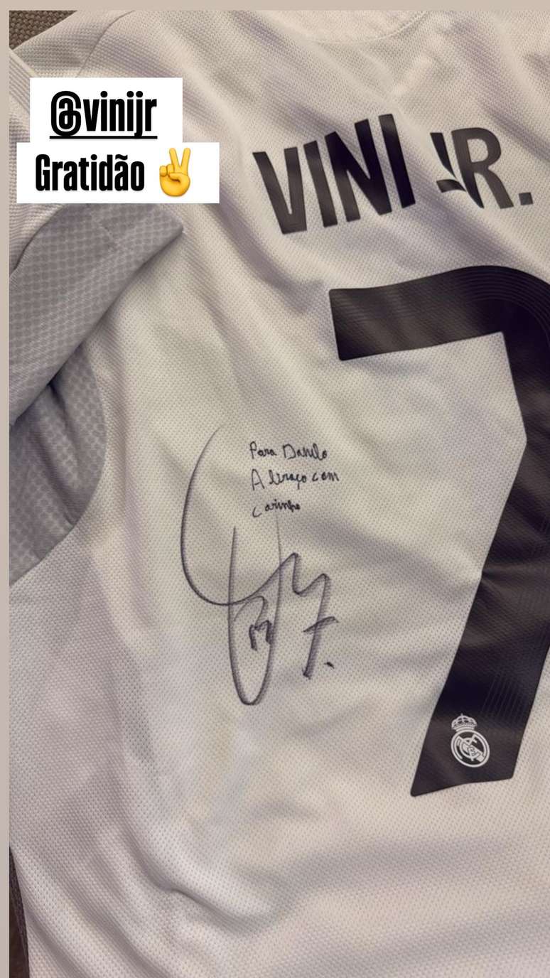 O namorado da mãe de Virginia Fonseca, Danilo Nascimento, chamou atenção nas redes sociais ao exibir um presente de peso: uma camisa autografada por Vinícius Júnior, atacante do Real Madrid. A peça, personalizada com o número 7 -- a mesma usada pelo craque em campo — foi mostrada por ele nos stories durante a madrugada desta sexta-feira (26).
