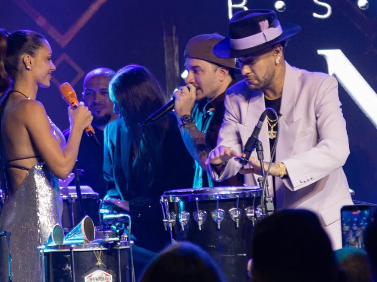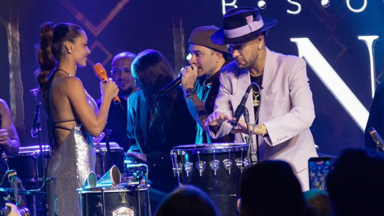 Neymar subiu ao palco com a esposa no momento em que o grupo de pagode começou a tocar Quando Você Passa (Turu Turu), de Sandy e Junior.