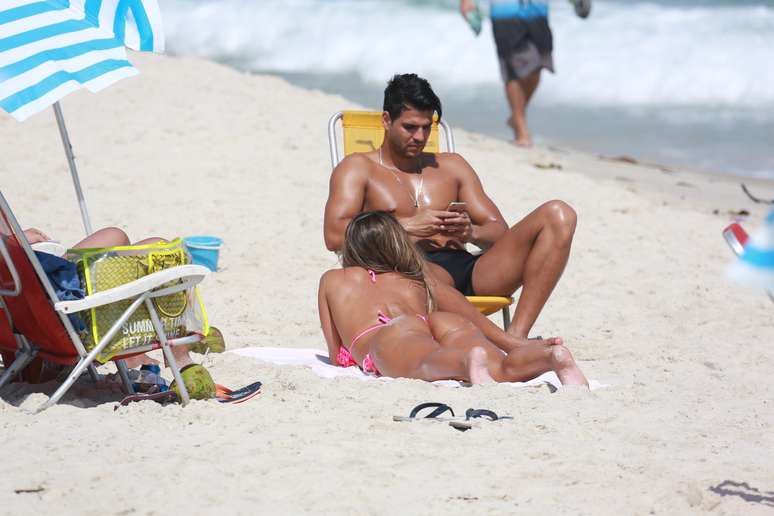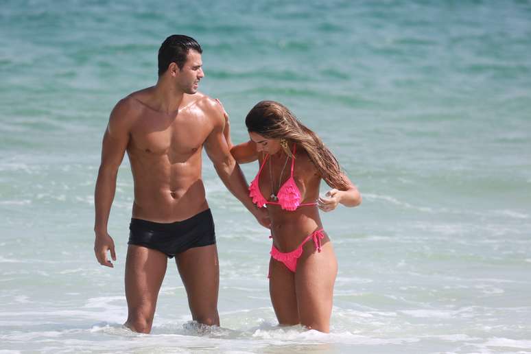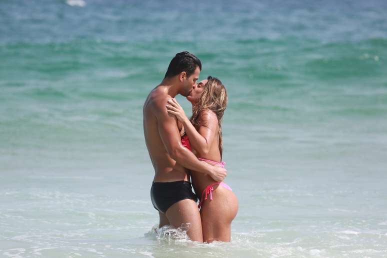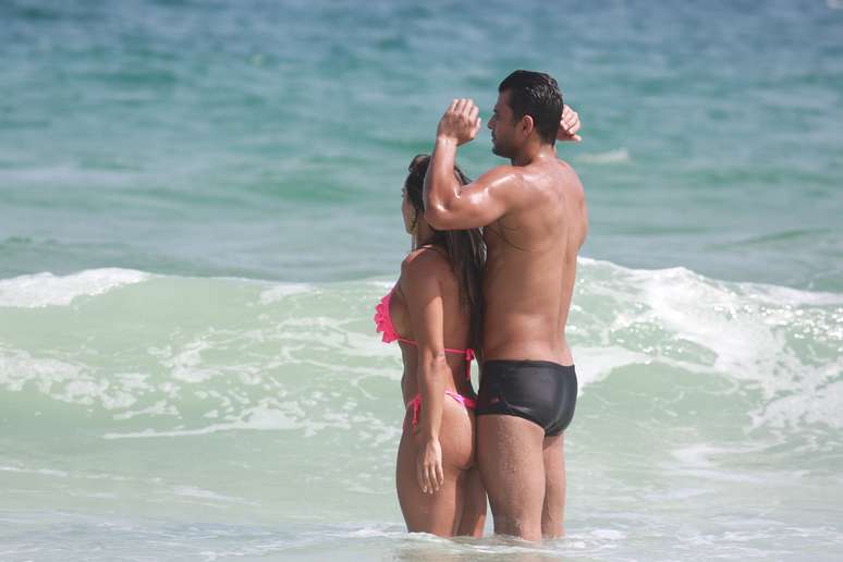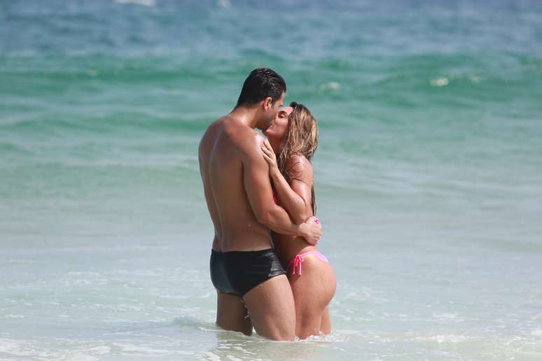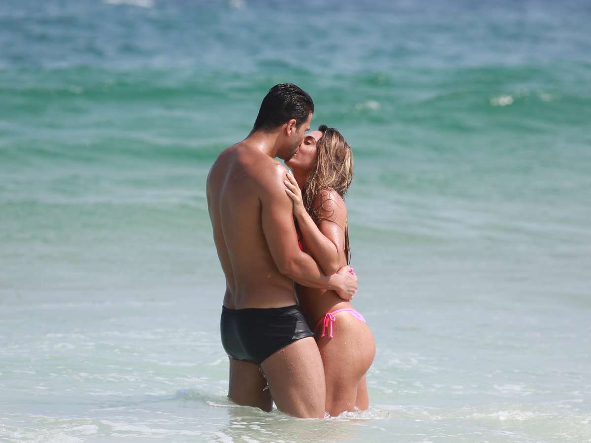 Após aproveitarem sol, os dois decidiram se refrescar no mar, onde trocaram muitos carinhos e beijos. Bahls ainda chamou atenção por usar um biquíni rosa que deixou em evidência seu belo bumbum e pernas torneadas.
