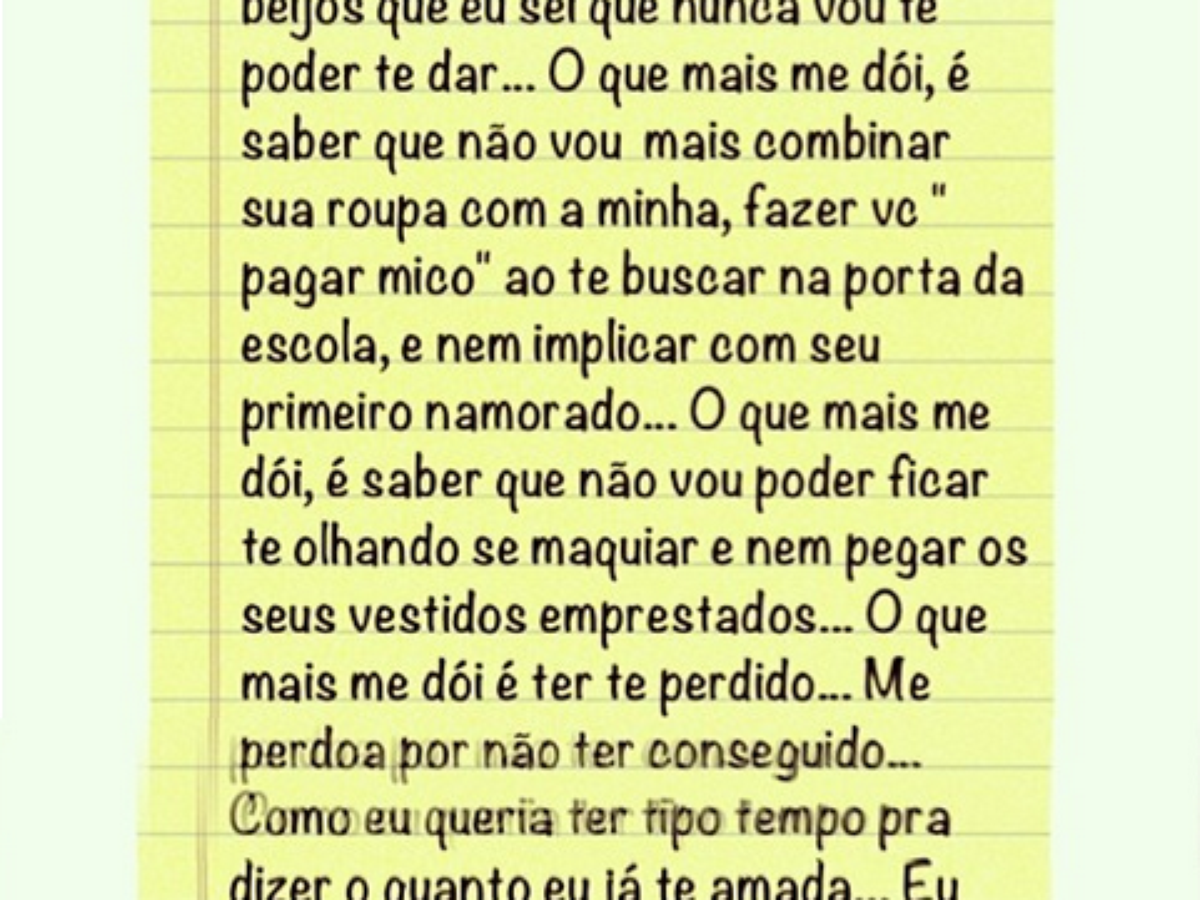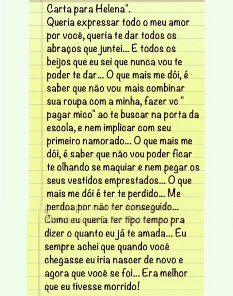 Na carta que postou para a filha, a qual pretendia chamar de Helena, Geisy lamenta o ocorrido. "Me perdoa por não ter conseguido, meu coração está despedaçado", e conclui: "era melhor que eu tivesse morrido".