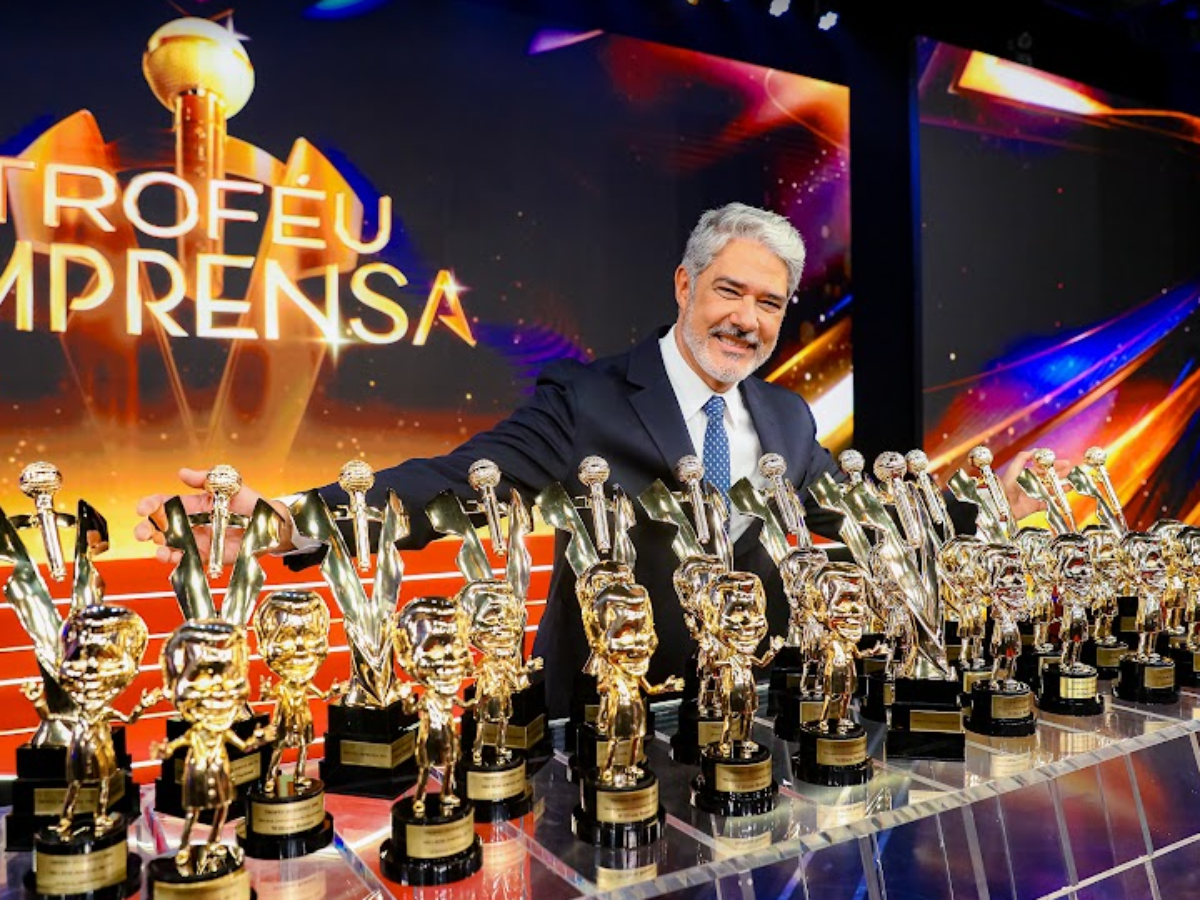 William Bonner fez uma participação icônica no Troféu Imprensa, exibido na noite deste domingo, 26, no SBT. O jornalista buscou os 33 estuetas que recebeu nos últimos anos e fez uma longa participação no palco do programa, onde conversou bem à vontade com Patrícia Abravanel e Celso Portiolli.
