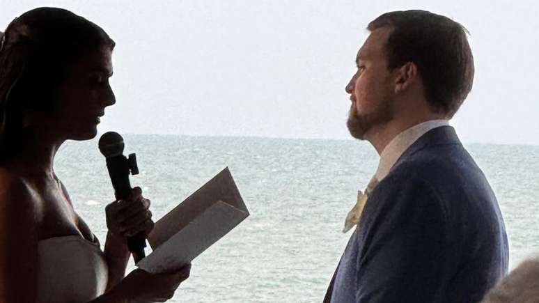 Luma César, filha do apresentador César Filho, riu durante os votos do noivo inglês, que trocou algumas palavras em português