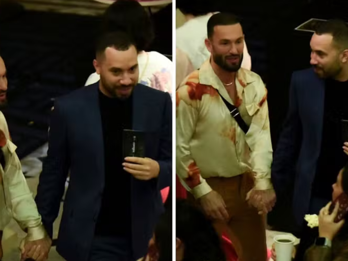 De mãos dadas, os ex-bbbs Gil do Vigor e Diego Hypolito surgiram em clima de romance durante estreia de Glória Groove como Madame Morrible no musical Wicked