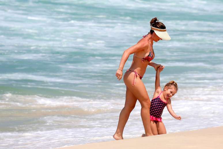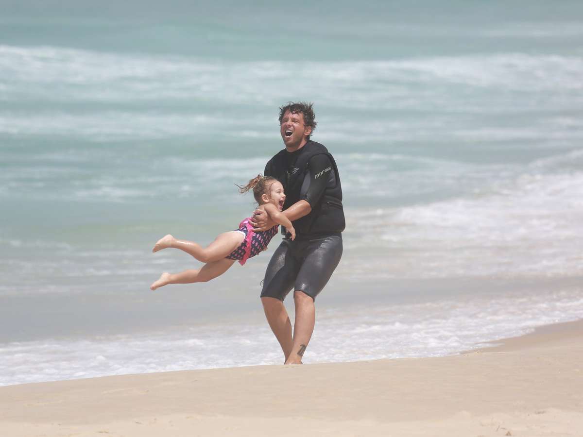 Mário deu uma volta com seu jet ski e depois brincou com Laura, que estava na areia com a mãe anteriormente. O ator hoje interpreta René, o ex-marido de Dandara (Emanuelle Araújo), na nova temporada de Malhação.