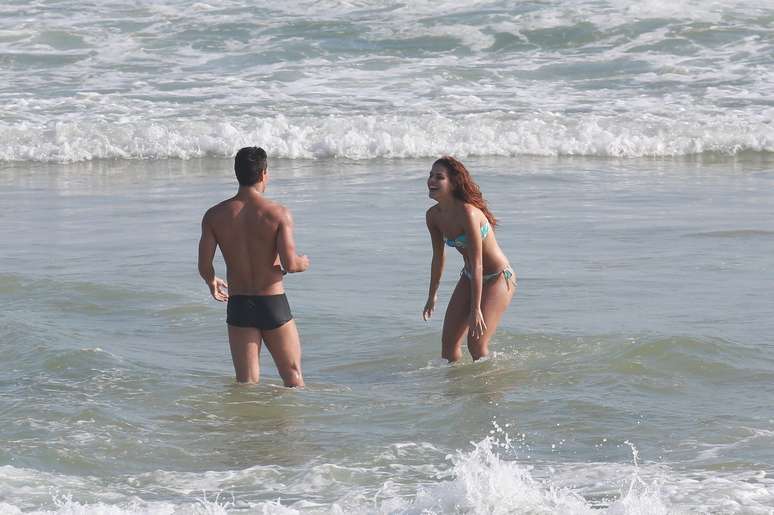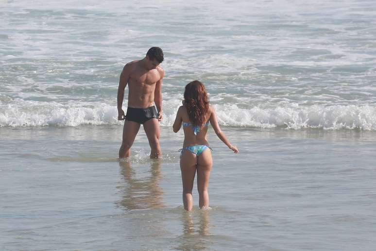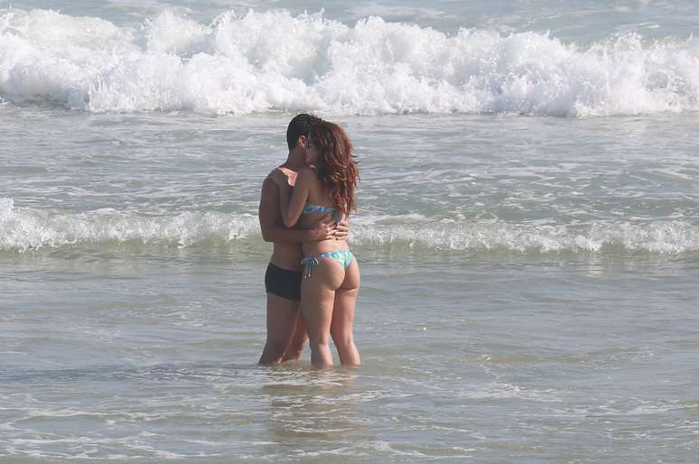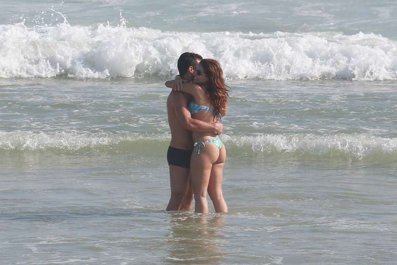 Paloma Bernardi e Thiago Martins trocam carinhos em praia