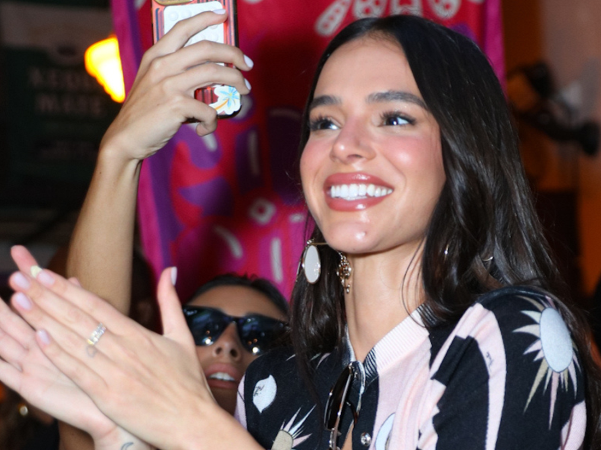 Bruna exibiu um conjunto listrado em tons claros, com camisa de manga longa e calça soltinha de modelagem confortável. Ela completou o look com um top cropped branco. No entanto, o que mais roubou a cena foi a bolsa da casa de moda de luxo espanhola LOEWE.