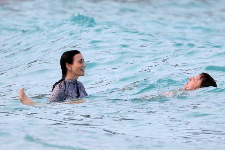 Em momento romântico, Paul e Nancy se divertiram juntos e deram um mergulho no mar.