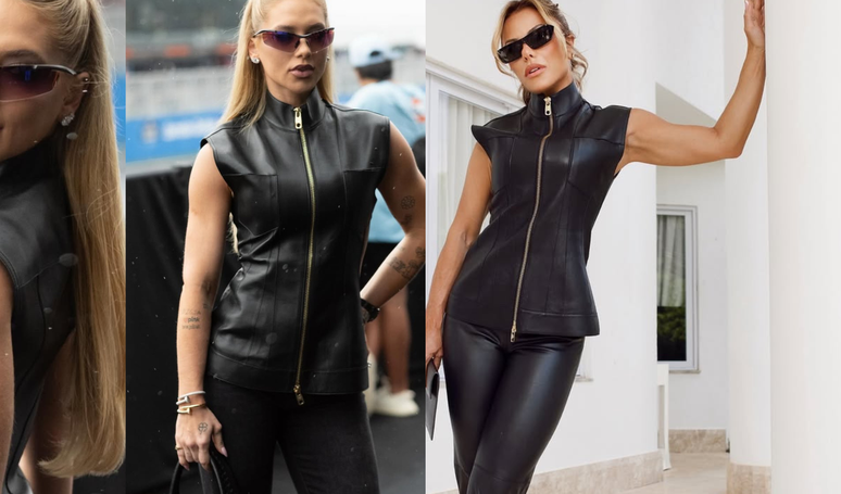 Ao melhor estilo "espiã fashionista" com pitadas de motoqueira urbana, a loira investiu em uma blusa estruturada de couro, de gola alta e zíper frontal aparente - peça statement que, curiosamente, já apareceu no guarda-roupa de Poliana Rocha, sua ex-sogra. "Amei a blusa", comentou a mãe de Zé Felipe em post da dona da "We Pink" com a vestimenta. Eita! Será que rolou um "empréstimo" familiar? Quem nunca, não é mesmo?