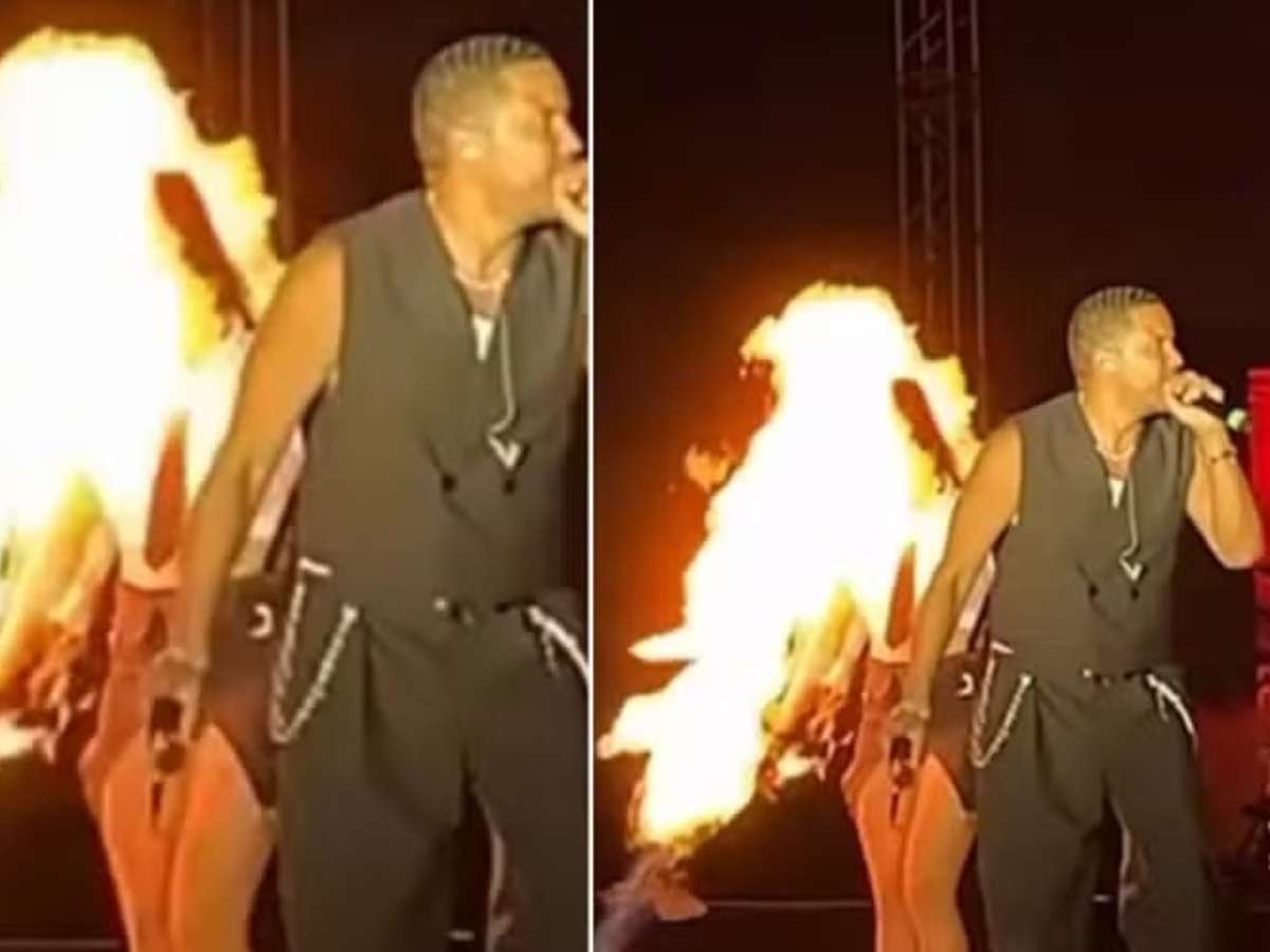 Pamela Labour, dançarina da banda Ilegales, foi surpreendida pelas chamas dos efeitos especiais no palco e precisou de atendimento médico