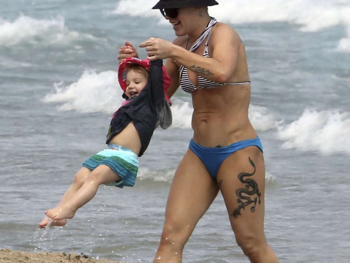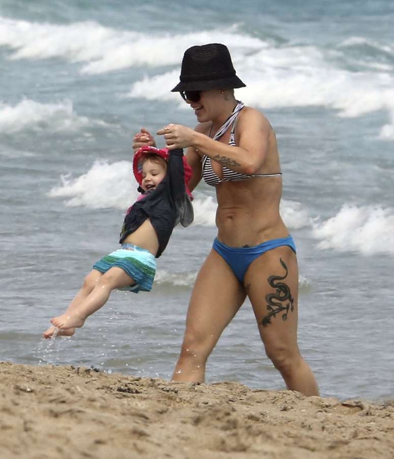 A cantora Pink, 33 anos, mostrou seu corpo musculoso ao brincar com a filha, Willow, de um ano e meio, e o marido, o piloto de motocross Carey Hart, em uma praia de Miami, nos Estados Unidos