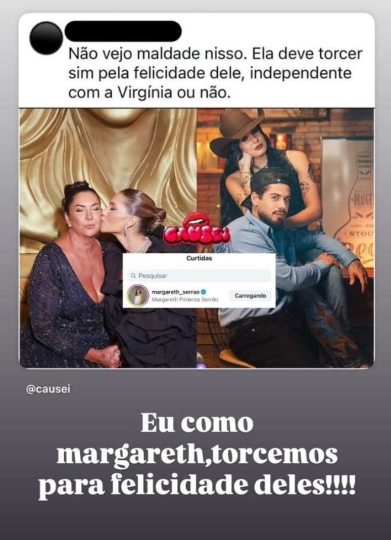 Tudo começou quando um post viralizou mostrando que a mãe de Virginia Fonseca curtiu uma foto de Zé Felipe com a Boiadeira. Poliana republicou a informação e acrescentou que tanto ela quando a ex-sogra do cantor estão a favor de ambos seguirem suas vidas amorosas: "Eu, como Margareth, torcemos para a felicidade deles".