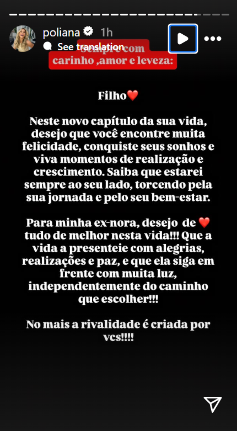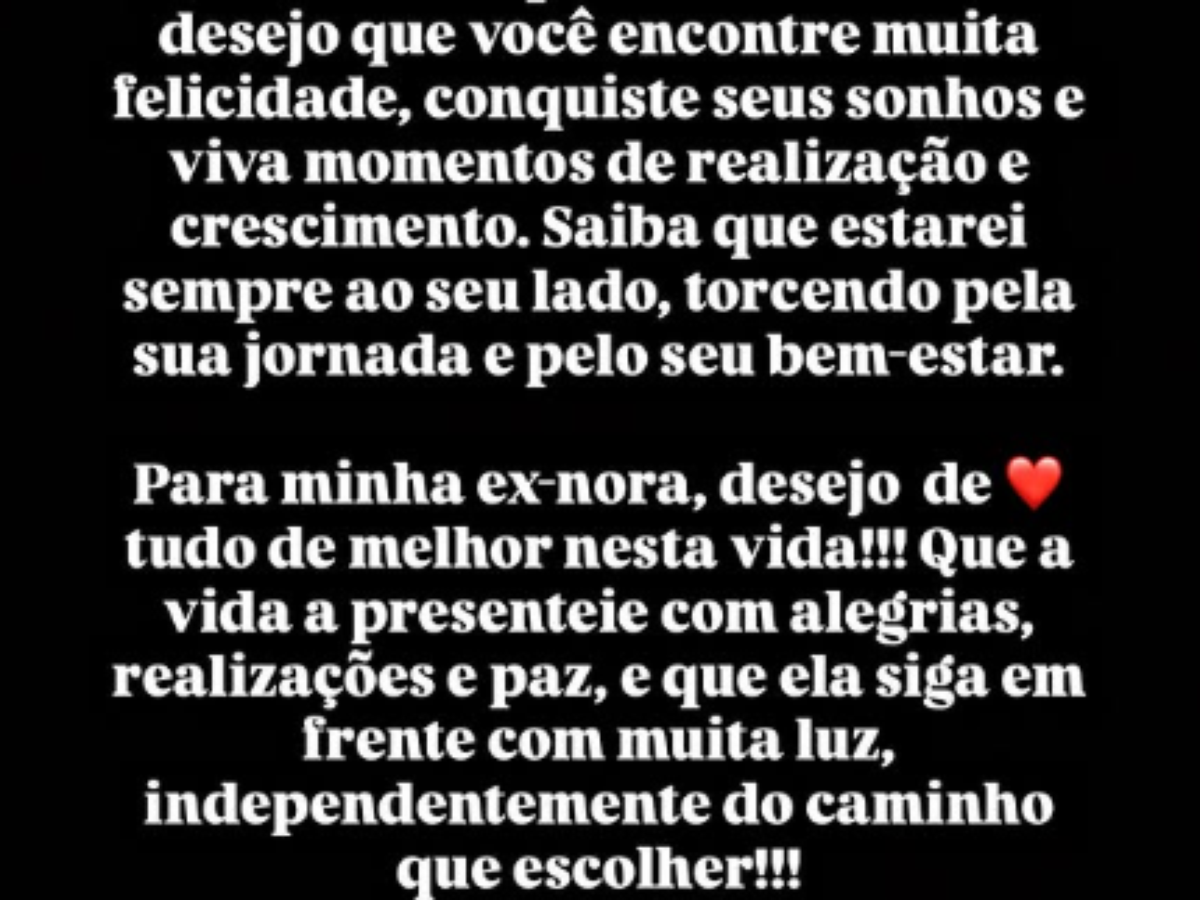 Na publicação, Poliana reforçou seu apoio a Zé Felipe em seu novo relacionamento com Ana Castela, desejando que ele realize seus sonhos e siga em paz. A jornalista também fez questão de se dirigir à ex-nora, desejando alegrias e muitas conquistas. A atitude chamou atenção pela postura conciliadora e carinhosa.