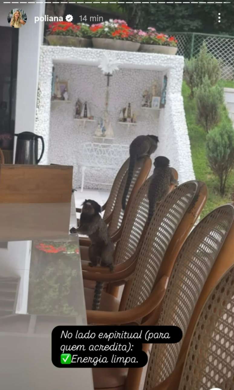 Após montar um galinheiro no jardim para a ave, Poliana contou que o espaço aberto acabou atraindo macaquinhos da região. Os animais circularam livremente pela área externa e chegaram a entrar na cozinha, subindo nas cadeiras da mesa de jantar e vasculhando o local em busca de comida.