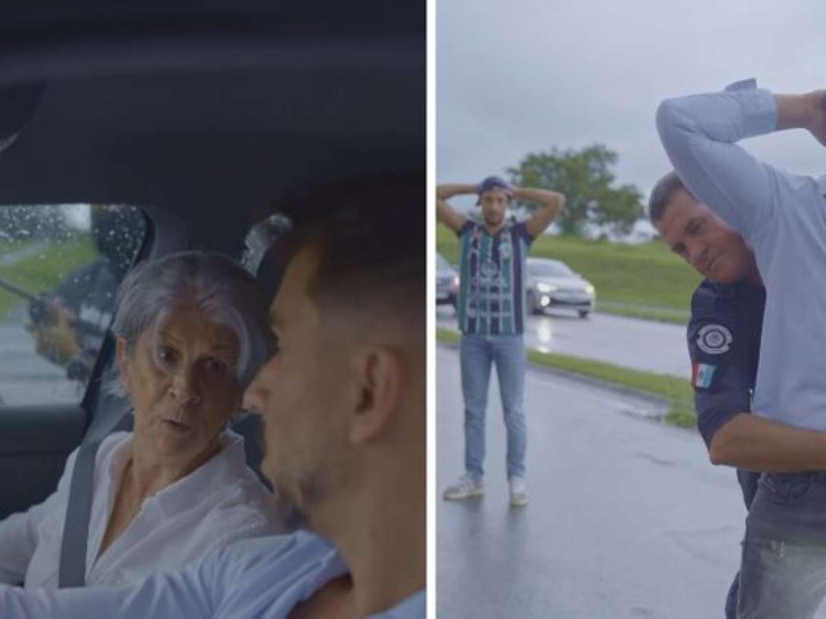 Julio, que seria a suposta vítima, coloca a cabeça para fora do veículo e anuncia que se trata de uma filmagem. Os policiais, então, pedem que desça do carro e vá até eles com as mãos na cabeça para uma revista.