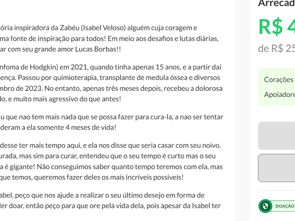 Em 2024, quando Veloso ainda não estava em remissão, ela abriu uma vakinha online para arrecadar dinheiro. O objetivo era conseguir R$ 20 mil para se casar com seu atual marido, que ainda acreditava na possibilidade de perder a amada para a doença, já que a expectativa de vida da jovem era de 4 meses.