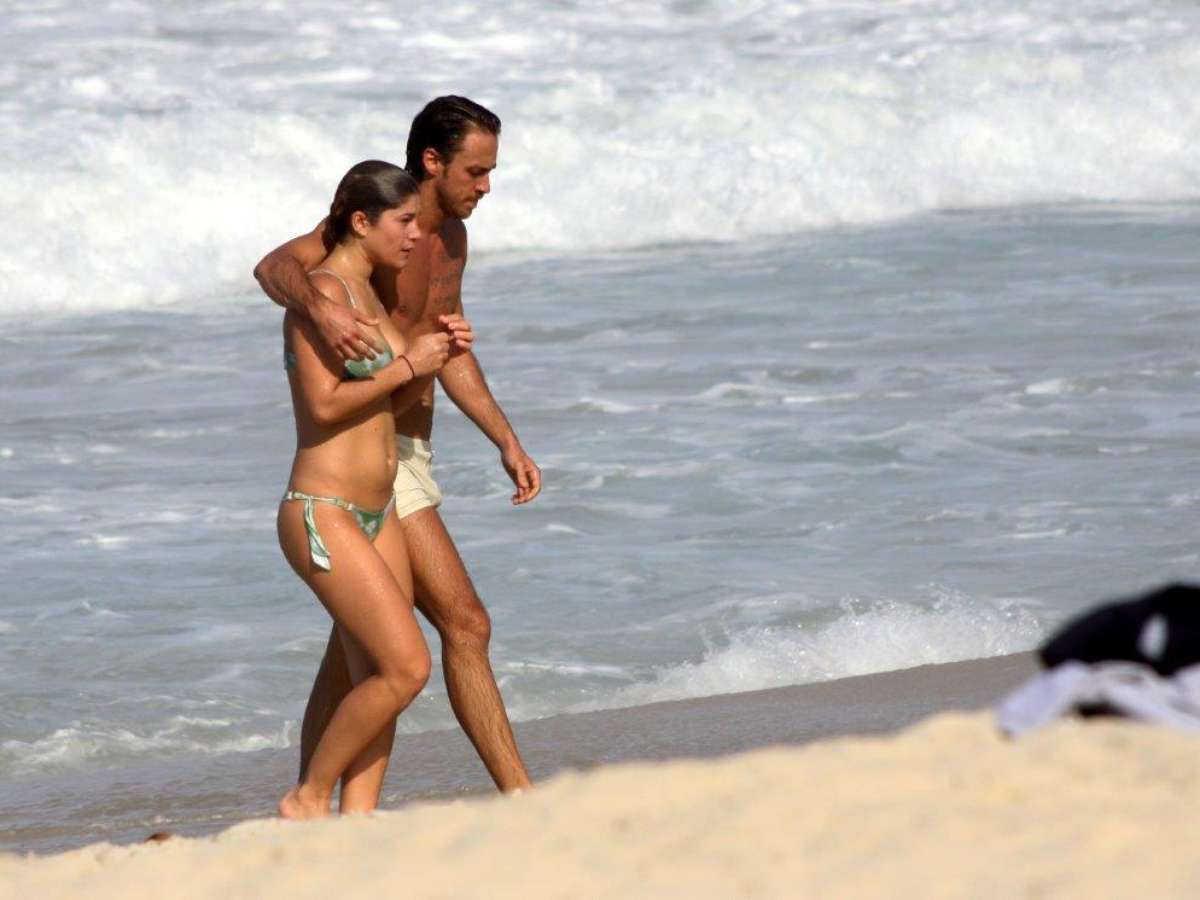 O casal caiu no mar e depois ficou batendo papo sentados na areia. A atriz só reparou a presença do fotógrafo quando estavam indo embora, a pé pelas ruas do bairro.