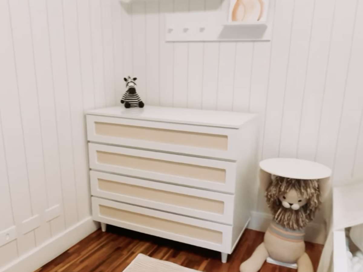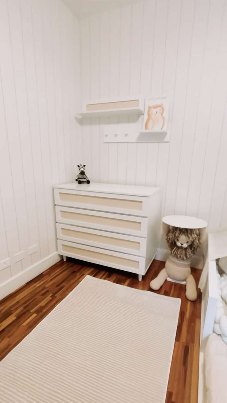 Ele ainda tem uma cômoda para guardar suas roupas. Também há um espaço para a criança conta fazer seus desenhos em cima de uma mesa. Uma verdadeira fofura!