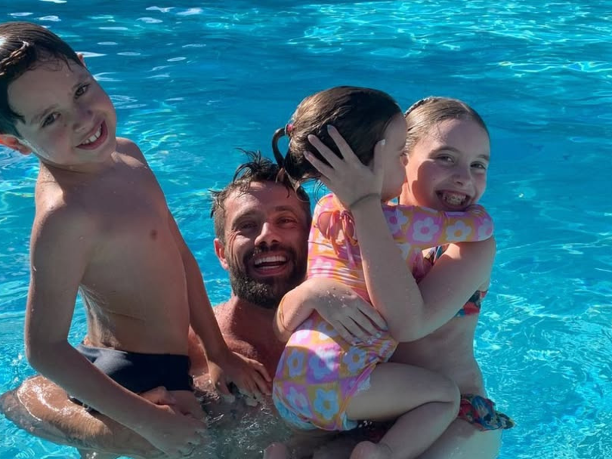 Nas imagens publicadas neste domingo, 26, ele aparece ao lado das crianças em uma piscina, junto com a namorada, Carol Ferraz.