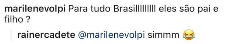 Rainer Cadete postou uma foto com seu filho Pietro, de 16 anos, e surpreendeu os seus seguidores. "Ele tem filho?", perguntou uma de suas fãs. Ao que o ator respondeu: "sim", com emoji de risada.