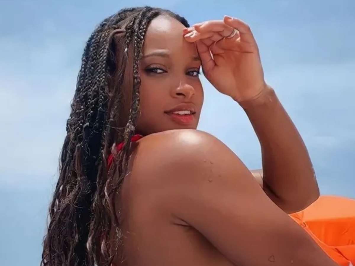 Rebeca Andrade exibiu um corpo escultural ao usar um biquíni fio-dental no Rio de Janeiro