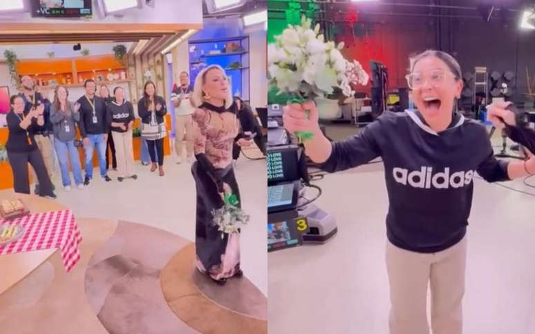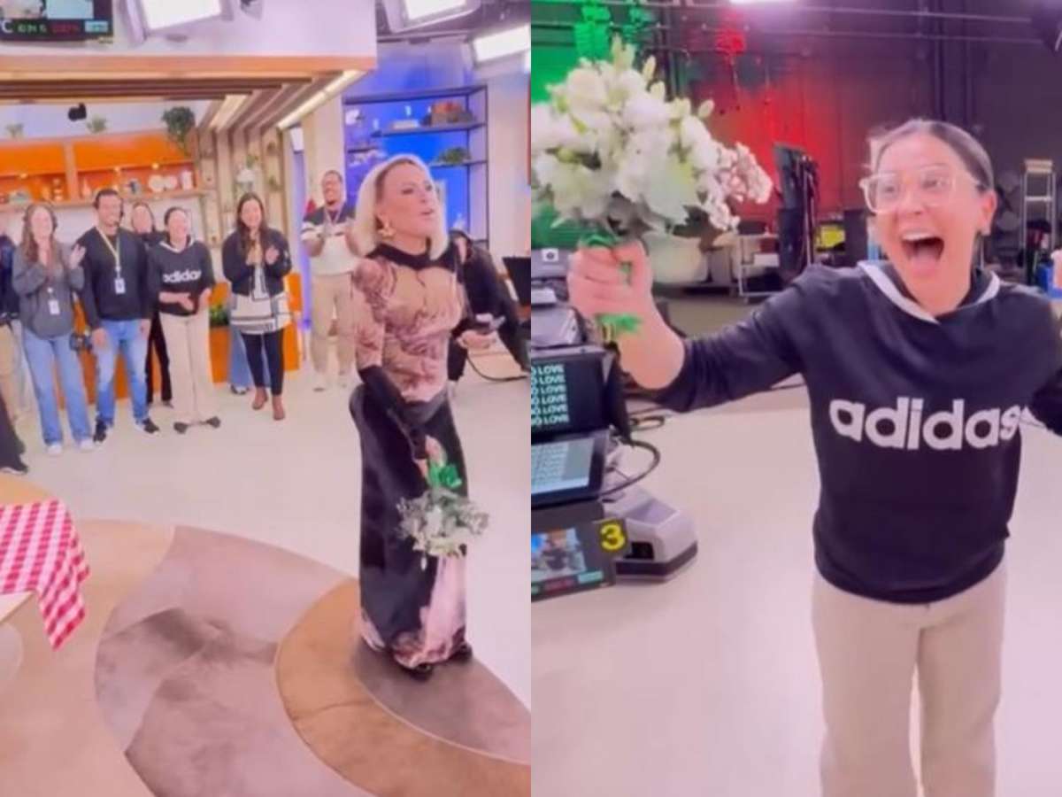 Ana Maria Braga, que está recém-casada após cerimônia intimista, faz brincadeira nos bastidores do 'Mais Você' e produtora pega buquê