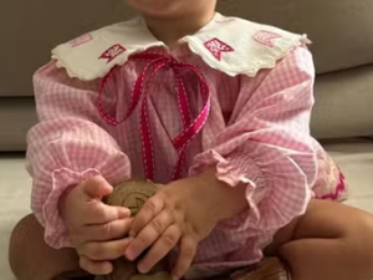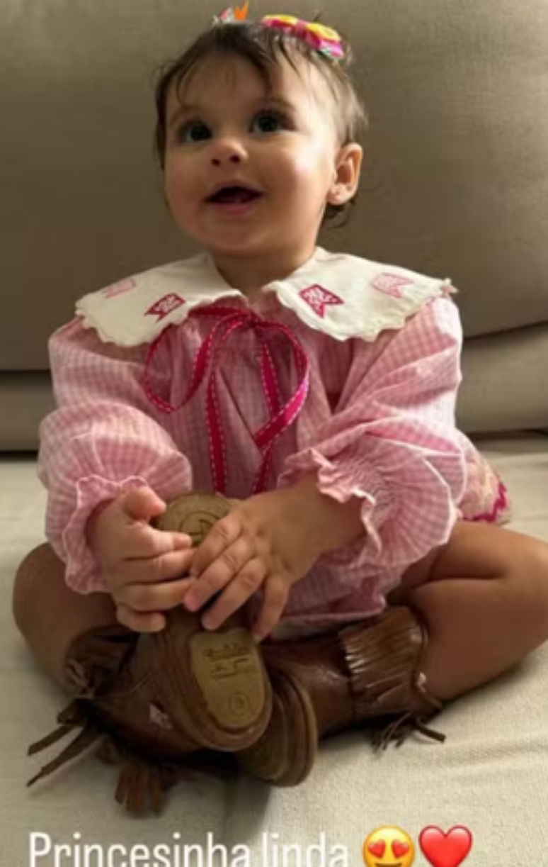 Na imagem divulgada nos Stories da plataforma, a menina aparece com um vestido xadrez cor-de-rosa, gola bordada, laços na parte frontal e presilhas de fita no cabelo, simulando maria-chiquinhas. Encantado, o jogador escreveu na legenda: "Princesinha linda".