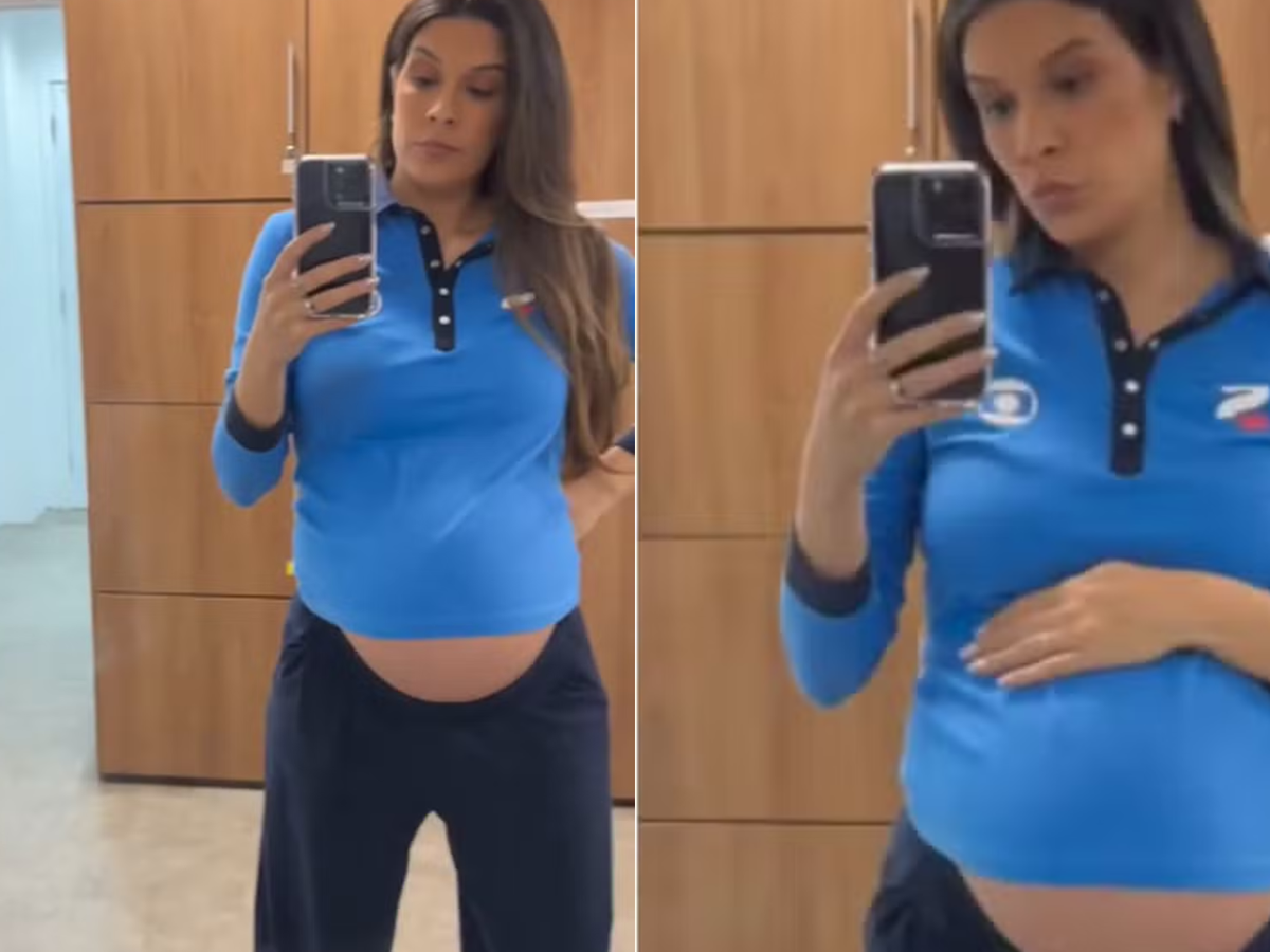 A narradora esportiva da Globo, Renata Silveira (35), mostrou com bom humor os "perrengues" da gravidez avançada em seu local de trabalho. Em um vídeo que viralizou nesta terça-feira (21), a jornalista revelou que o uniforme da emissora está visivelmente apertado, com a camisa polo não mais comportando a barriga.