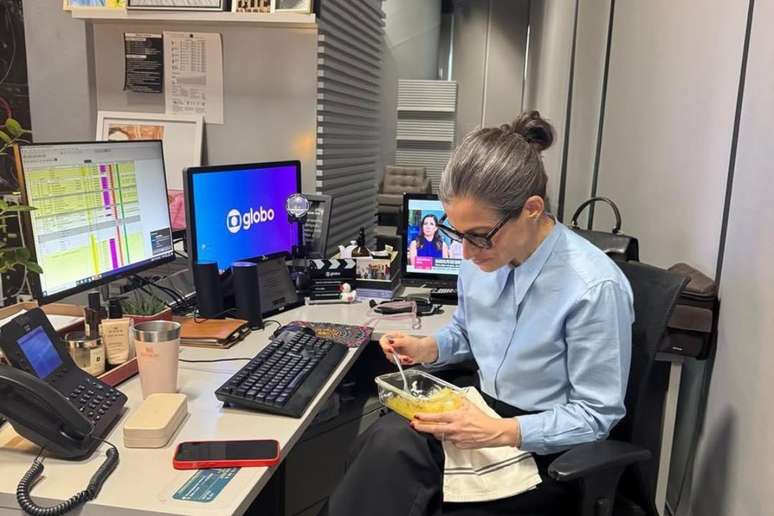 A apresentadora do Jornal Nacional, Renata Vasconcellos, de 53 anos, foi flagrada comendo uma marmita em sua mesa, na redação de jornalismo da Globo, no Rio de Janeiro.