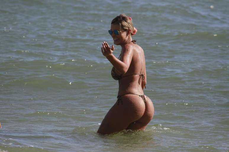 Com o corpo repleto de curvas destacadas pelo fio-dental, Andressa Urach fez a alegria de paparazzi e banhistas do Rio de Janeiro