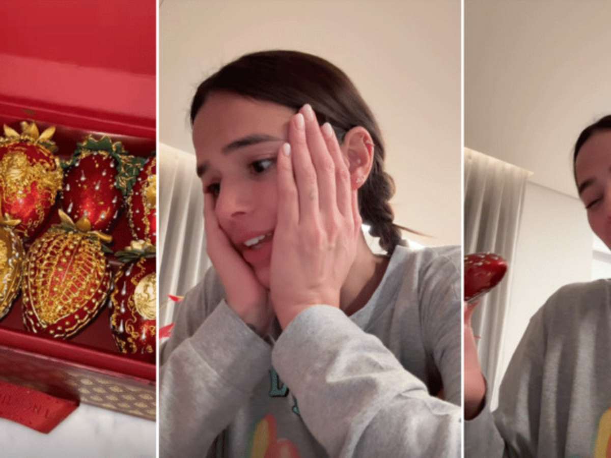 A Atriz Bruna Marquezine ganha presente luxuoso de confeiteiro e mostra nas redes sua reação à sobremesa inspirada em joias russas
