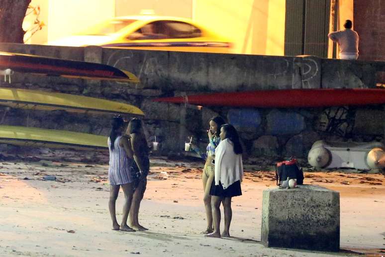 Dando um tempo em seus compromissos profissionais, Rihanna aproveitou o início da noite deste sábado (12) para visitar a praia da Urca, no Rio de Janeiro. Ela estava acompanhada de três amigas, que também trabalham como suas assistentes.