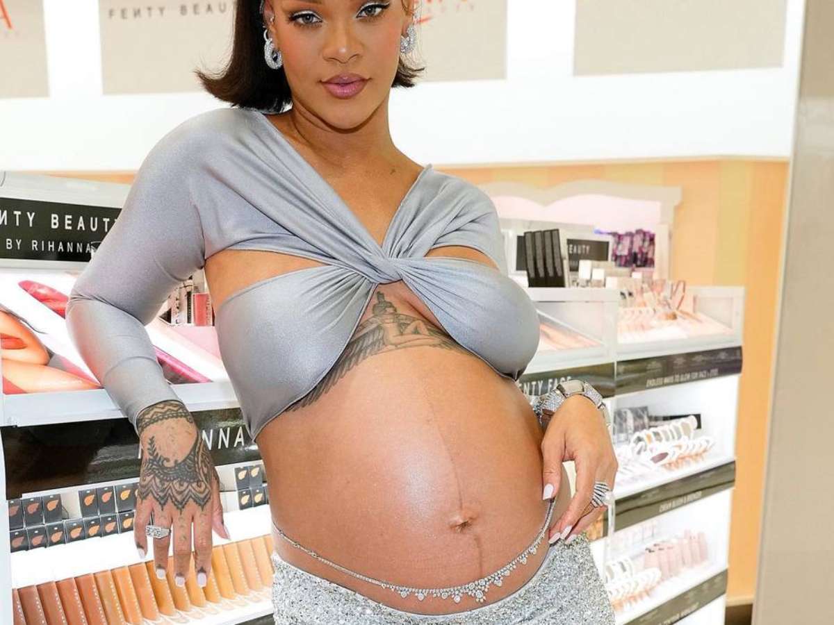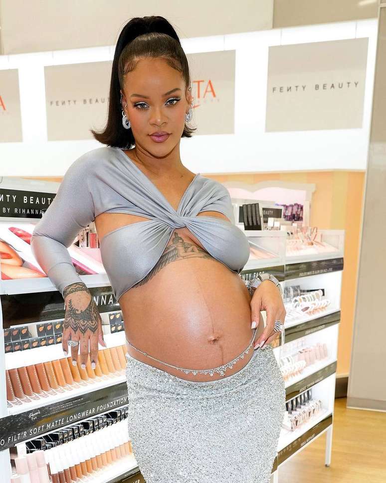 No último final de semana, a Fenty Beauty, marca de cosméticos de Rihanna, promoveu um evento para apresentar a nova coleção de maquiagem para repórteres, blogueiras e profissionais da beleza. Como já era de se esperar, a mamãe do ano roubou todos os holofotes para si mesma, exibindo o barrigão num look prateado.