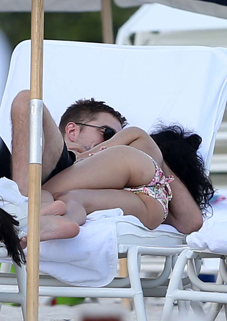 Robert Pattinson e a namorada, a cantora FKA, foram clicados enquanto curtiam um momento romântico em uma praia de Miami (EUA). Os dois tomaram sol em espreguiçadeiras à beira-mar, tomar drinks e se beijaram. Depois, a artista saiu para uma caminhada.
