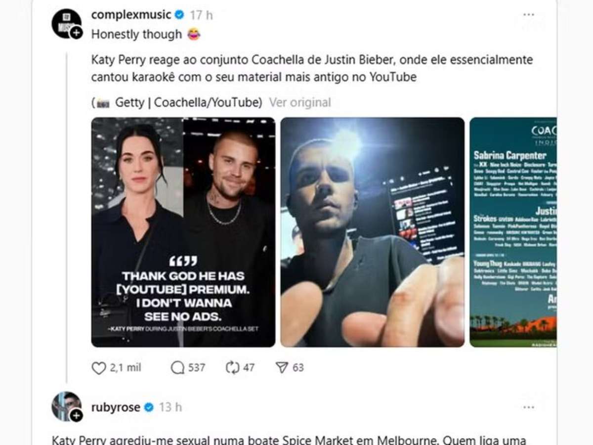 Ruby também afirmou que manteve silêncio por anos após receber ajuda profissional de Katy Perry em um momento específico de sua carreira, o que teria contribuído para que não expusesse o caso antes.