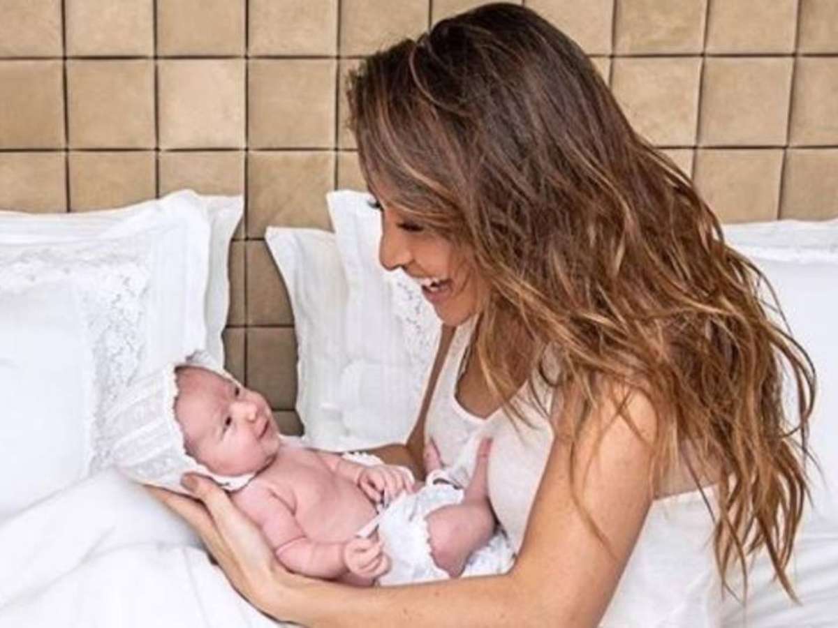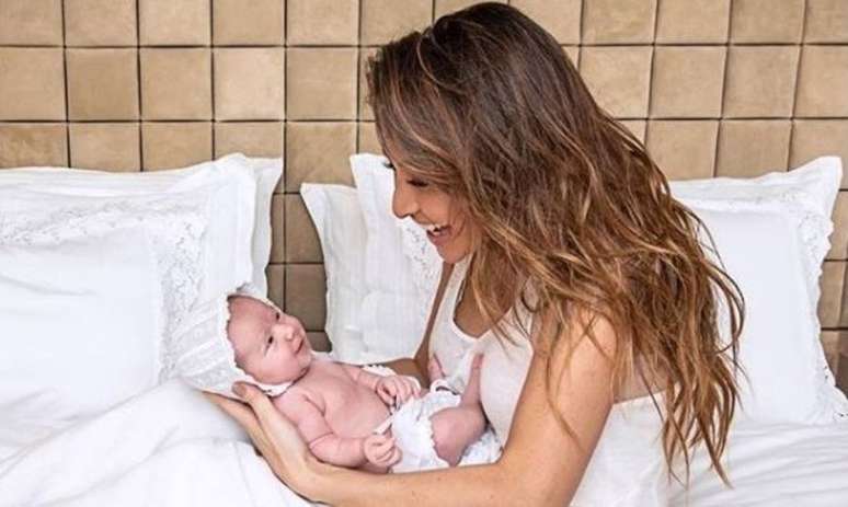 A apresentadora da Record deu à luz a filha Zoe há dois meses e foi parabenizada pelo marido, Duda Nagle, com a pequena ao lado.
