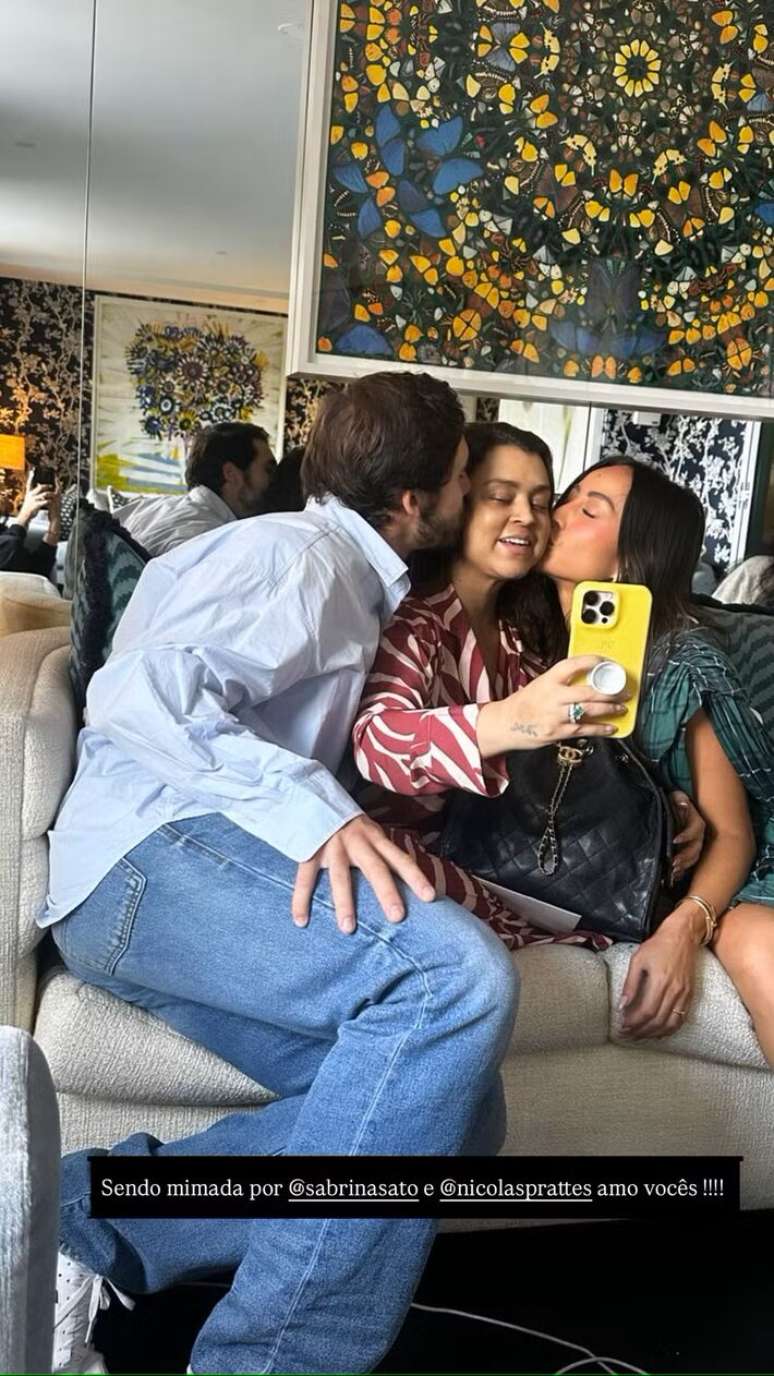 Nos Stories do Instagram, Preta compartilhou o momento, mostrando o casal dando um beijo em seu rosto. "Sendo mimada por Sabrina Sato e Nicolas Prattes, amo vocês!", legendou.
