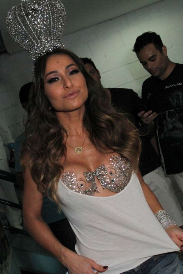 De shortinho, sandália, decote e coroa na cabela, Sabrina, que é rainha de bateria, esteve acompanhada do namorado, João Vicente de Castro.