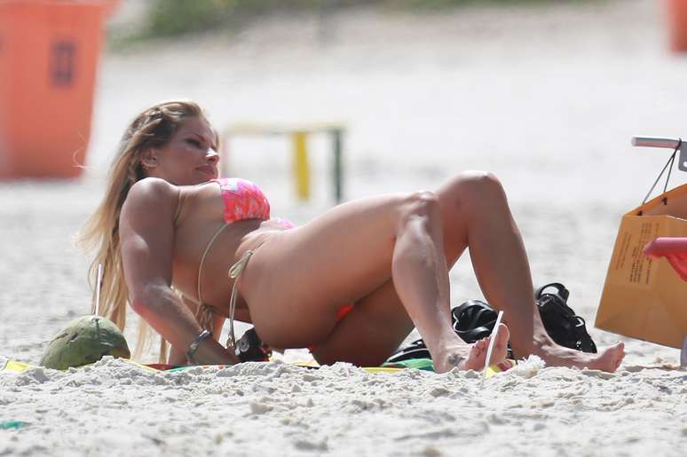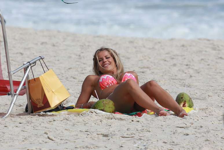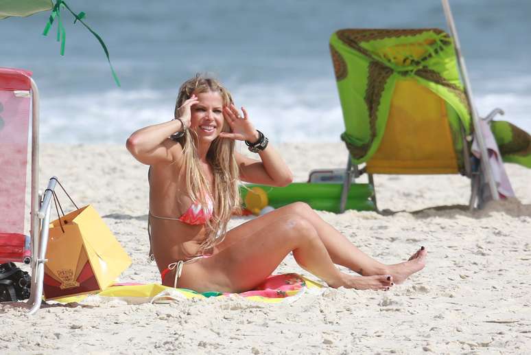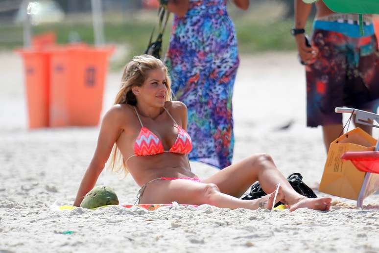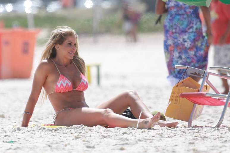 Karina Bacchi aproveitou a terça-feira (3) de sol no Rio de Janeiro para cutir um dia de praia e pegar um bronzeado. A apresentadora esteve na praia do Pepe, na Barra da Tijuca, onde mostrou o corpo em forma e o abdômem malhado ao usar um biquíni fluorescente.