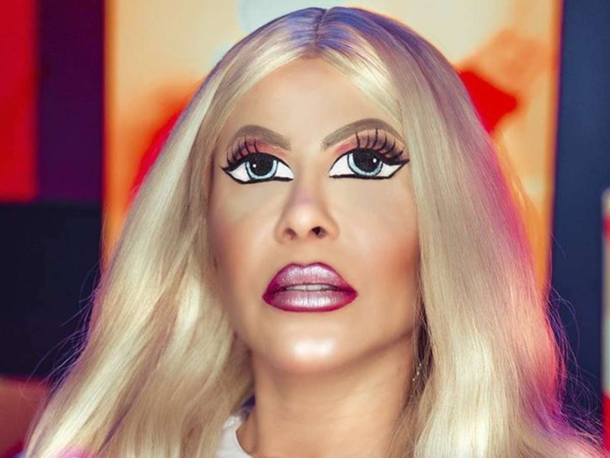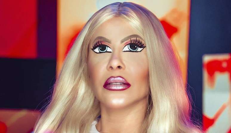 Na foto, a cantora aparece com lábios, olhos e maquiagem exageradas, se assemelhando a uma boneca Barbie.