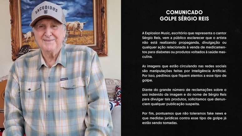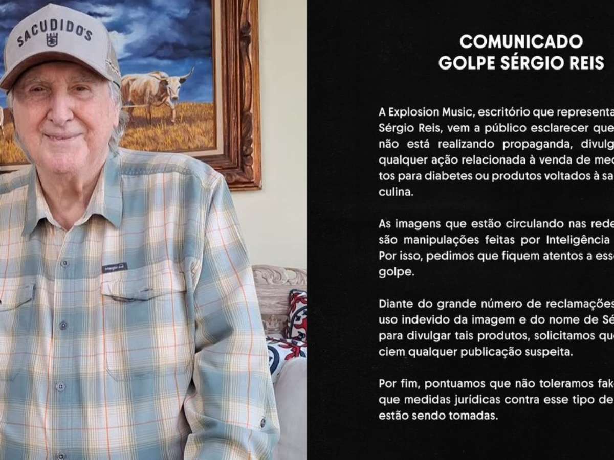 A Explosion Music, empresa que gerencia Sérgio Reis, emitiu um comunicado alertando sobre a circulação de imagens falsas do cantor nas redes sociais. O alerta foi divulgado nesta quarta-feira (3) após a empresa receber diversas reclamações sobre publicações fraudulentas que associam o artista à venda de medicamentos para diabetes e produtos para saúde masculina.